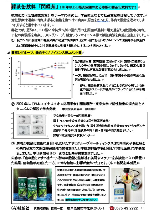 2025年7月1日に「閃緑茶」の酸化還元電位(ORP−076mv)を計測しました。