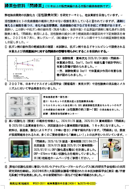 東レグループ、(㈱)鎌倉テクノサイエンス様と試験課題:抗ガン剤副作用に対する被験物質「閃緑茶」の作用検討で、前例のない実験系で試験委託契約を締結しました。被験物質は、上記、閃緑茶を使用しています。